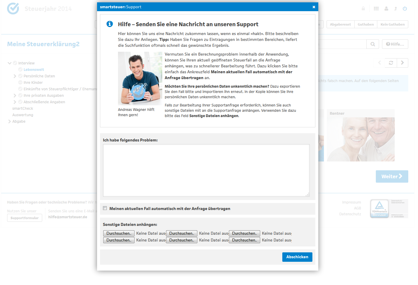 Bei Fragen oder Problemen können Sie sich jederzeit an unseren Support wenden. Die Kontaktdaten zum E-Mail-Support haben wir oben im Navigationsmenü unter »Hilfe« für Sie zusammengefasst.